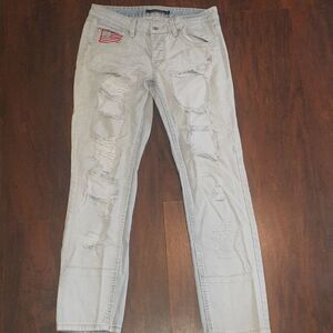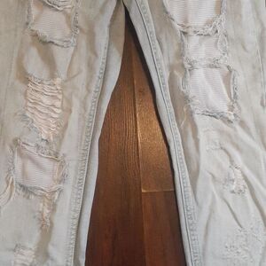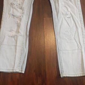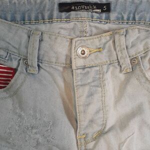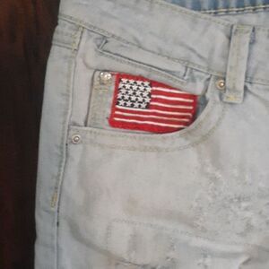 size 5. lovesick light denim Jean's from hot topic. distressed as shown with patchwork. American flag patch on these near pocket as well. in good shape slight defects as shown. ankle length.