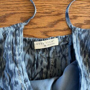 Beautiful Lovestitch boho maxi dress in a soft blue and gray print. Features adjustable tie straps with tassel ends, ruffle detail at the bust, and a flowy, pleated silhouette with a ruffled hem. Lightweight and perfect for summer, beach days, or casual outings. Size M, excellent pre-owned condition.