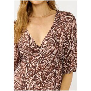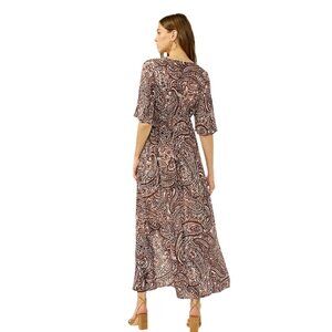 Whispers of Earthlight Maxi Dress A tapestry of dusk and desert bloom, this paisley Lovestitch maxi dress weaves together earthy brown and natural tones with a whisper of gold metallic thread—like sunlight caught in a canyon breeze. The deep V neckline and high front slit invite movement and mystery, while elbow-length flutter sleeves offer a grounded grace.