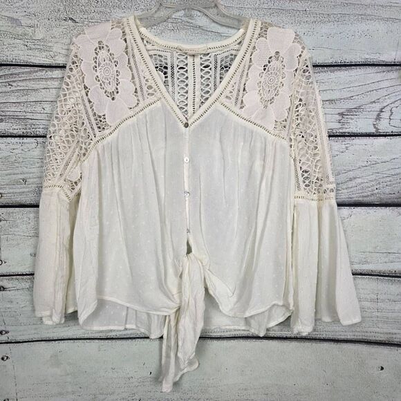 Lovestitch women’s size large white boho-style blouse featuring intricate crochet lace panels, floral embroidery, and tie-front hem. Made from lightweight woven fabric with flowy bell sleeves and partial button front. Perfect for layering or pairing with denim.