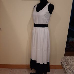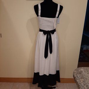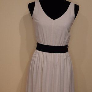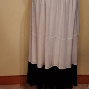 M047. Cream & black linen blend dress from Lovestitch is of heavy rayon/linen gauze & fully lined to the bottom black hem panel. V-neck tank dress styling with wide comfortable adjustable straps, tiered full skirt & elastic panel back for a no-gap fit! Great summer staple...picture with sandals and a garden hat!