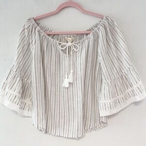 Love Stitch Off The Shoulder Striped Top. Split neckline with tassel tie closure. Flared bell sleeves with crochet lace inserts. Bardot silhouette. Soft linen blend fabric.
