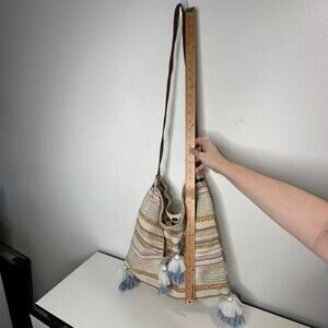 Lovestitch Tan Multicolor Striped Canvas Boho Bag Drawstring Snap Close Leather Strap Zippered Interior Pocket Large Tassel Pom Accents