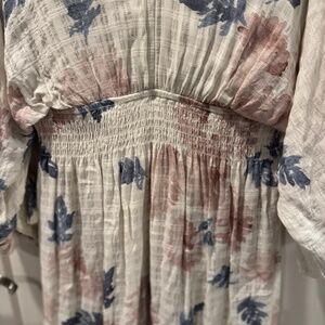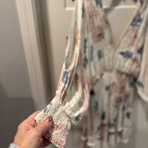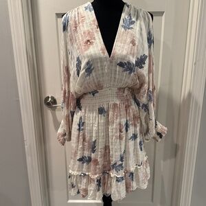 Lovestitch V-Neck Mini Dress, Size M, EUC. Pink/Blue Floral print on cream background, ruffle on skirt, Long sleeve with openings (cold shoulder style) on arms. Fully lined.