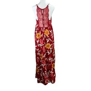 A bohemian sleeveless tiered maxi slip dress in a floral print. Features a lace trim v-neckline, sheer lace racer back with button detail, tiered skirt, and adjustable spaghetti straps