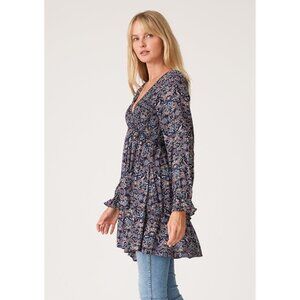 An ultra-bohemian, long sleeve tunic top in an intricate paisley print. Pretty yet laid back, this flowy tunic top is the perfect bohemian statement piece for fall. With long sleeves, a flattering empire waist, and a deep v-neckline to show off that décolletage.