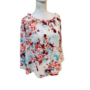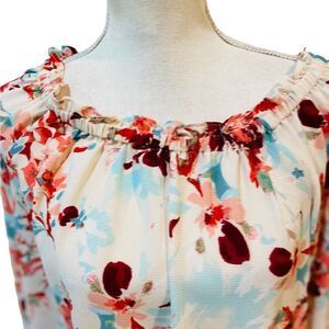 This peasant blouse with elastic neckline by Love Stitch is a floral feminine top. In hues of blush, aqua, pinks & burgundy. Feminine. Romantic! 3/4 sleeve. Made of polyester & spandex. Stretch & softness. Like new condition.