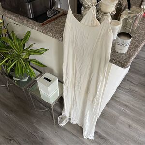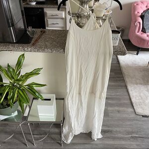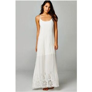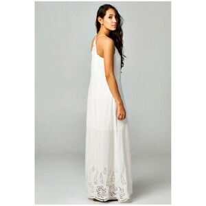 This pretty white maxi dress is your answer to the hot summer sun! In a lightweight fabric and spaghetti straps, this racerback cut dress can easily go from day to night. The long sleeveless fit and flared dress features a stunning eyelet accent along the hem with a tie back detail in the back. Put your hair in a ponytail, slip on some flip flops and head on out for some Memorial Day fun!