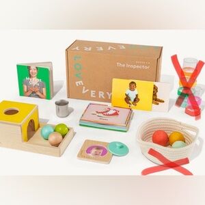 The Inspector Play Kit with ball drop, balls, cards, metal cup, first puzzle, and board book. Missing: cups and treasure basket.