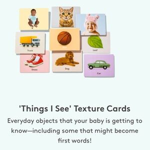'Things I See' Texture Cards from Lovevery Inspector play kit, 7-8 months. Used condition with some wear on some cards, one with a nibble on the side :). Perfectly functional. Everyday objects that your baby is getting to know—including some that might become first words!