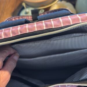 USB Port for Power Bank, Tissue Pocket, Luggage Strap and so so much organization!!! The laptop backpack is made of sturdy nylon material. Navy blue with pink/white stripe. Shiny gold zippers and accents. The bag has never been used and should have been in perfect condition, however, when taking photos I noticed small tear on top of laptop sleeve, inside main compartment (see photo). It can easily be stitched together. From non-smoking home.