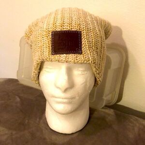 Comfy slouchy beanie. A cream neutral color with a leather brown tag on the front. Super cute, worn a few times.