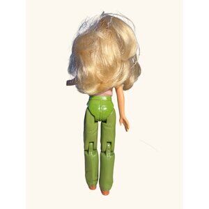 This doll is ready for any adventure, even if it's just a trip to the couch! With her stylish pink sweater and green cargo pants, she's always prepared for a fashion statement. And let's not forget, she's got the hair that every shampoo commercial dreams of.