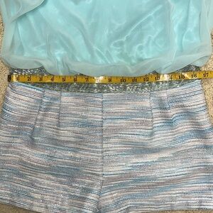Label has been removed. This will be your go-to romper of the season! A sweet mint chiffon top pairs perfectly with a beaded band waist and mint and blue striped shorts. The sweetest romper for the season. Your new one-and-done! A keyhole design at the back gives a feminine touch. The Silky Halter also features Bead Accents with a Hook and eye closure and a full hidden zipper. Excellent condition. Stock photos for fit and style. Approximate measurements in photos.