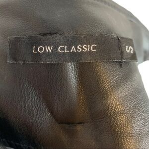 Gently pre-owned Low Classic Black Down Pocket Faux Leather Pants Size Small. Relaxed-fit paneled grained faux-leather trousers in black. High-rise. Three-pocket styling. Belt loops and detachable and adjustable pin-buckle belt at waistband. Flap pockets at knees. Press-stud vents at inseam. Darts at back.