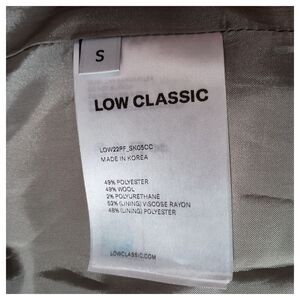The Low Classic Skirt is a stylish and versatile piece suitable for various occasions, including casual, formal, workwear, and business settings. This pencil midi skirt in a solid gray color is made from a wool blend fabric with a zip closure and high rise waist. The skirt features a cut out accent and is lined for added comfort. Ideal for the fall, winter, and spring seasons, this skirt is machine washable and measures 30 inches in length, making it a perfect addition to any woman's wardrobe. Made in South Korea, this skirt from the LOW CLASSIC brand offers a sophisticated and classic look. Waist: 26"