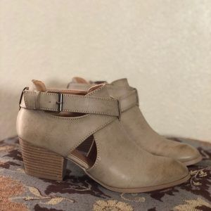 Comfy low heel ankle boot. Color is warm taupe.