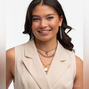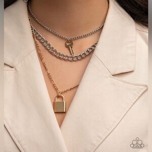 Three industrial silver and gold chains cascade in various lengths across the chest, creating a radiantly edgy display. The uppermost chain features a gold key charm, while a gold lock charm embellishes the lowermost chain creating a heavenly pendant at the bottom of the longest chain in a radiant finish. Features an adjustable clasp closure.