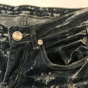There are rhinestone on the pocket edges and front button. It says size 27, which is a size 3 in juniors. They’re hemmed for someone about 5’3.
