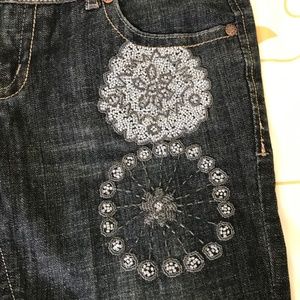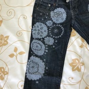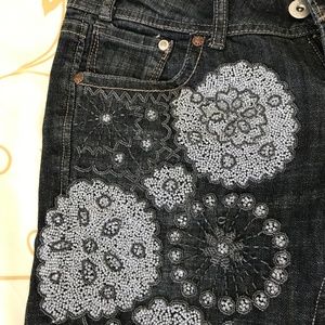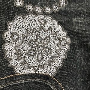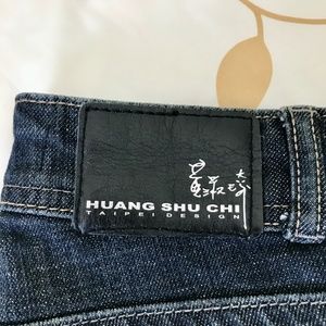 Worn only a few times, very low rise, size small and slim. The beading on these jeans is incredible and very detailed. Bought in Taiwan by well know Taiwan designer brand. Huang Shu Chi. https://www.huangshuchi.com/en/. In great shape all beading intact with only one loose bead on the left side. Really unique pair of jeans. I love them but after two kids can't fit them anymore. Waist measured 15.75 ". From top to bottom of crotch 7.5". Waist to bottom cuff 37.5". Inseam 31".