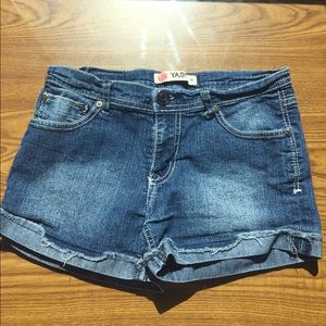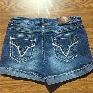 Low rise. Professional white stitching across shorts. 4 pockets. Blue color. Denim. The size shown on the pants is 14 (not U.S. size), the shorts size according to the U.S. Scale is 0-2.