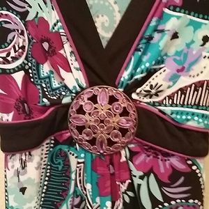 This is a great summer dress with a low-cut v-neck. It has a wrap around tie that is connected to it with a purple Jewel feature in the center. The dress is black, different hues of purple, teal, white & hues of green. I cut the tag off so I do not know the size, but it is stretchy material and I would say it would fit a 4 or 6 in women's and probably medium to large in juniors or perhaps a 7/8 in juniors. Barely used in excellent condition. Smoke and Pet free home. Offers welcome!