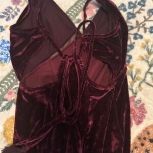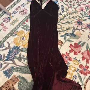 This sexy and breathtaking velvet dress is stretchy and comfortable, and will surely turn heads. In pomegranate wine, a low back, slit on the leg, and small mess detail below the breast
