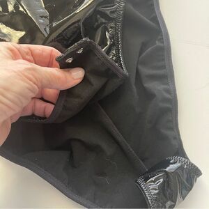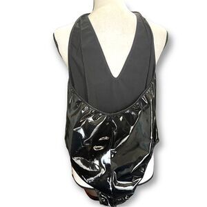 Wet look/plastic look bodysuit with halter top and crotch snap closure. Seriously looks like a black plastic bag but that's definitely not what you will look like wearing. Super sexy and unique!