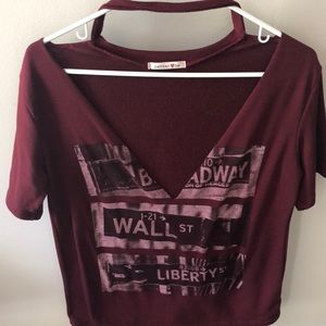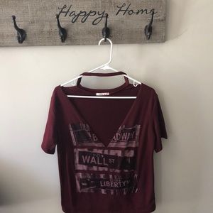 Maroon shirt with a lowcut v-line. this shirt also has a connect piece by the neckline