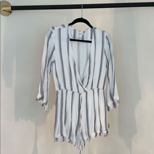 Super comfortable romper with 3/4 sleeves and tied waist - fringe detail around sleeves and shorts. Great condition. Usually worn with a pin to hold low cut too together but can also be worn over a top or low cut.