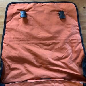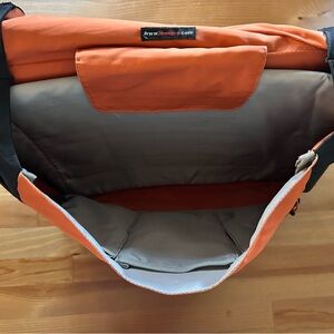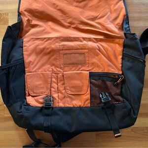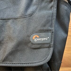 Spacious and durable Lowepro messenger bag in black with signature orange interior lining. Ideal for carrying camera gear, laptop, or travel essentials.