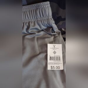 From Pro Player these are all poly pieces. Camo top is a large. Measures 24" from armpit to armpit. The gray shorts are new in a size medium. Measures 16" across the waist without stretching ,length is 20". Clean from a smoke free home.(WP)