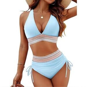 Lowock NEW Women's High Waisted 2 Piece Bikini Set Light Blue Size Large
