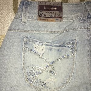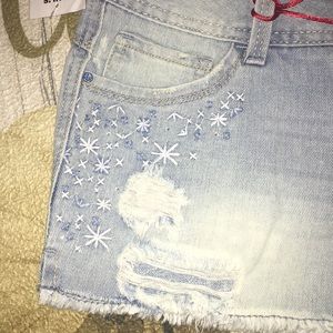 Brand new never worn with tags!! Light wash distressed Jean shorts with gorgeous details on front and back!! Size 7.