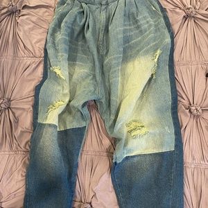 ~~ - Low-slung, slouchy with Zip fly, button closure, back elastic band, hand-distressing and fading throughout, oversized pockets, patching, mending...... Artful and perfectly distressed. Inconsistency is part of the LOOK!! No two items will be 100% identical.