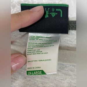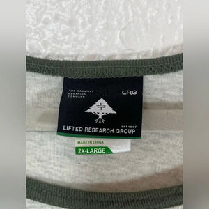 Lrg Lifted Research Group Logo Graphic Crew-Neck Short-Sleeve T-Shirt Men’s Size 2XL. Made in China. 100% Cotton. Machine washable. Has a mark on the sleeve.