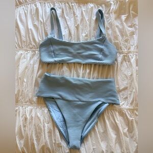 Jess Bikini Top and high waist Desi bottoms. Tags have been removed. Top is size D and bottoms are large. Gently worn. In good condition. Shade of blue in covershot slightly darker than actual bikini.