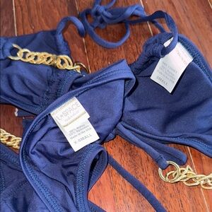 Small top and XS bottom. Stylish navy blue bikini featuring elegant gold chain accents. Perfect for a chic beach look.
