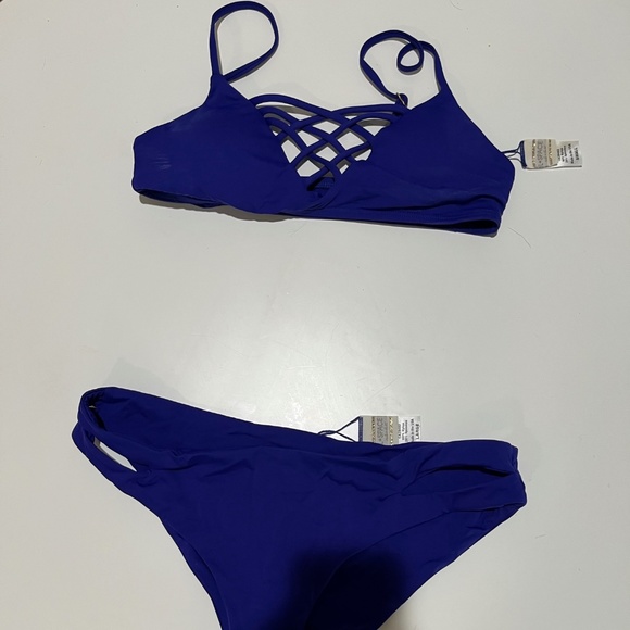 Cute deep blue bikini with cut outs on top and bottom. Top is a small and bottoms are a large but fit like a medium.