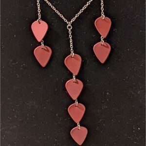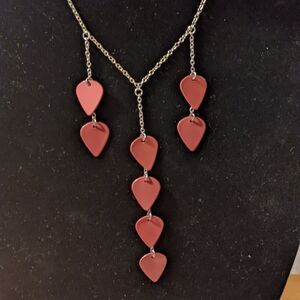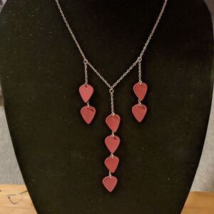 Neat 3 string necklace with light pink drops attacked to a tristed links silvertone chain. each piece moves freely in it's spot. Drops each measure 1/2" x .60". necklace measures 15 1/2" - 18". New