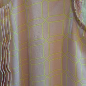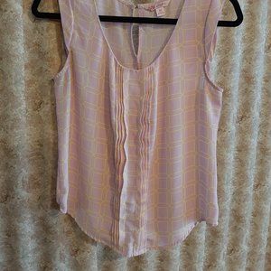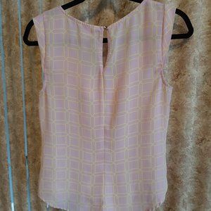 Light pink and yellow geometric print sleeveless top by Candies. Size is Medium. Pleat detail down front of top, cap sleeves, button at back of neckline. Curved hem.
