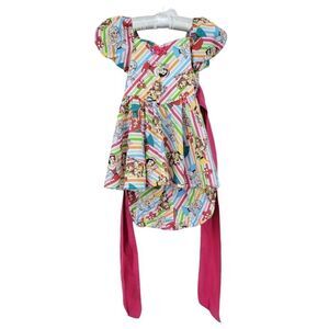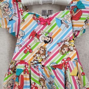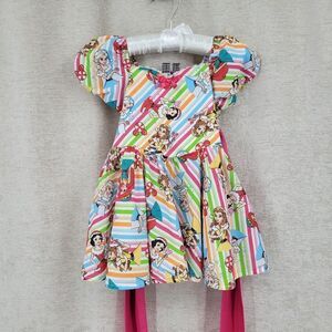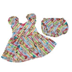 Adorable Disney princess dress with matching bloomers. Features colorful stripes and princess prints. Perfect for little ones.