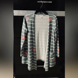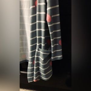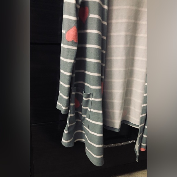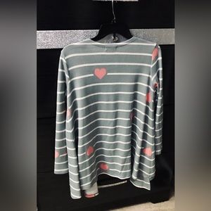 Small, light gray, white stripes, light pink hearts, 95% polyester 5% spandex, excellent condition