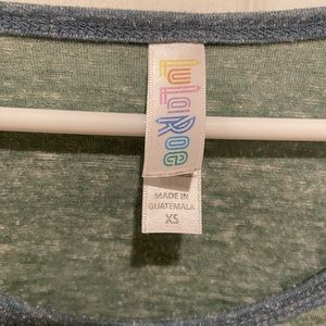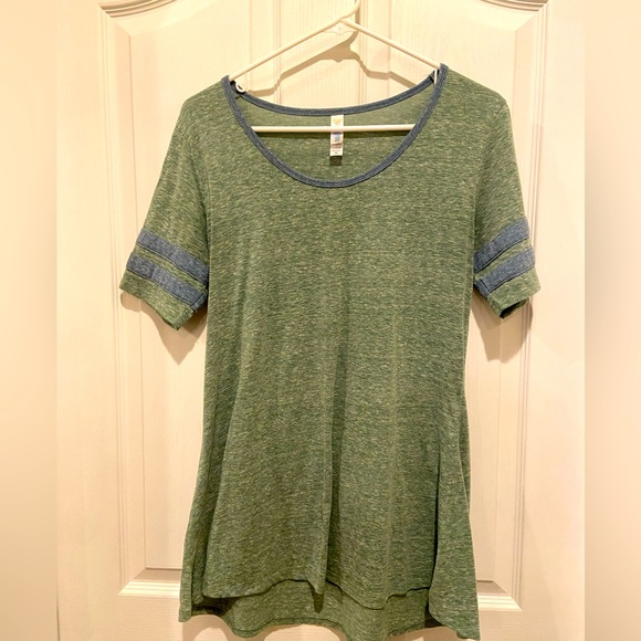LuLa Roe Classic Tee. Heather green with Heather blue stripes. Size XS but fits like a medium. Freshly laundered. Smoke free home.