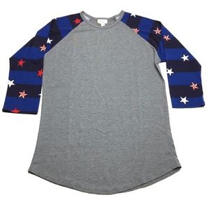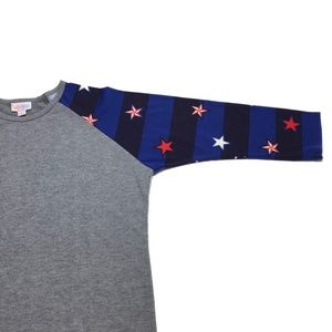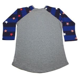 LuLaRoe 3/4 Sleeve Shirt Top 4th of July Gray Red White Blue Stars Womens