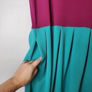 Features : stretchy knit fabric, structured, sophisticated, handset box pleats, flowing, full skirt, short sleeved, pockets, two-tone, purple, teal