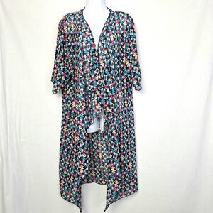 LuLaRoe women’s kimono duster, size Medium. Multicolor Aztec-inspired geometric print in teal, coral, yellow, and black. Lightweight polyester, drapes beautifully with an open front and asymmetrical hem.