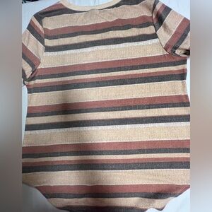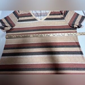 This LuLaRoe t-shirt features a fitted design with short sleeves, crafted in a soft knit fabric. The earthy brown and tan color palette offers a versatile and stylish look, perfect for casual wear. Its classic t-shirt style ensures comfort and ease for everyday activities.
