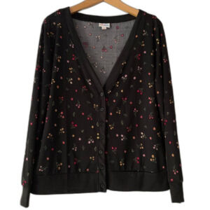 Super cute Floral print Cheryl Cardigan on black background. Size XS. This item runs a little on the large side. Light and flowing material.
