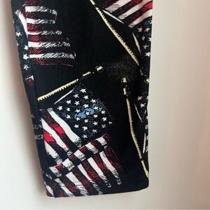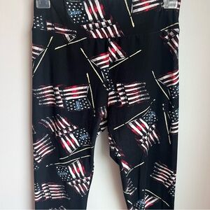 Experience comfort and style with LuLaRoe's leggings featuring a patriotic print of the American flag on a black background. These full-length leggings are crafted from a stretchy material, ensuring a form-fitting silhouette perfect for casual wear. The vibrant pattern adds a unique touch to your wardrobe, making them a versatile choice for any occasion.